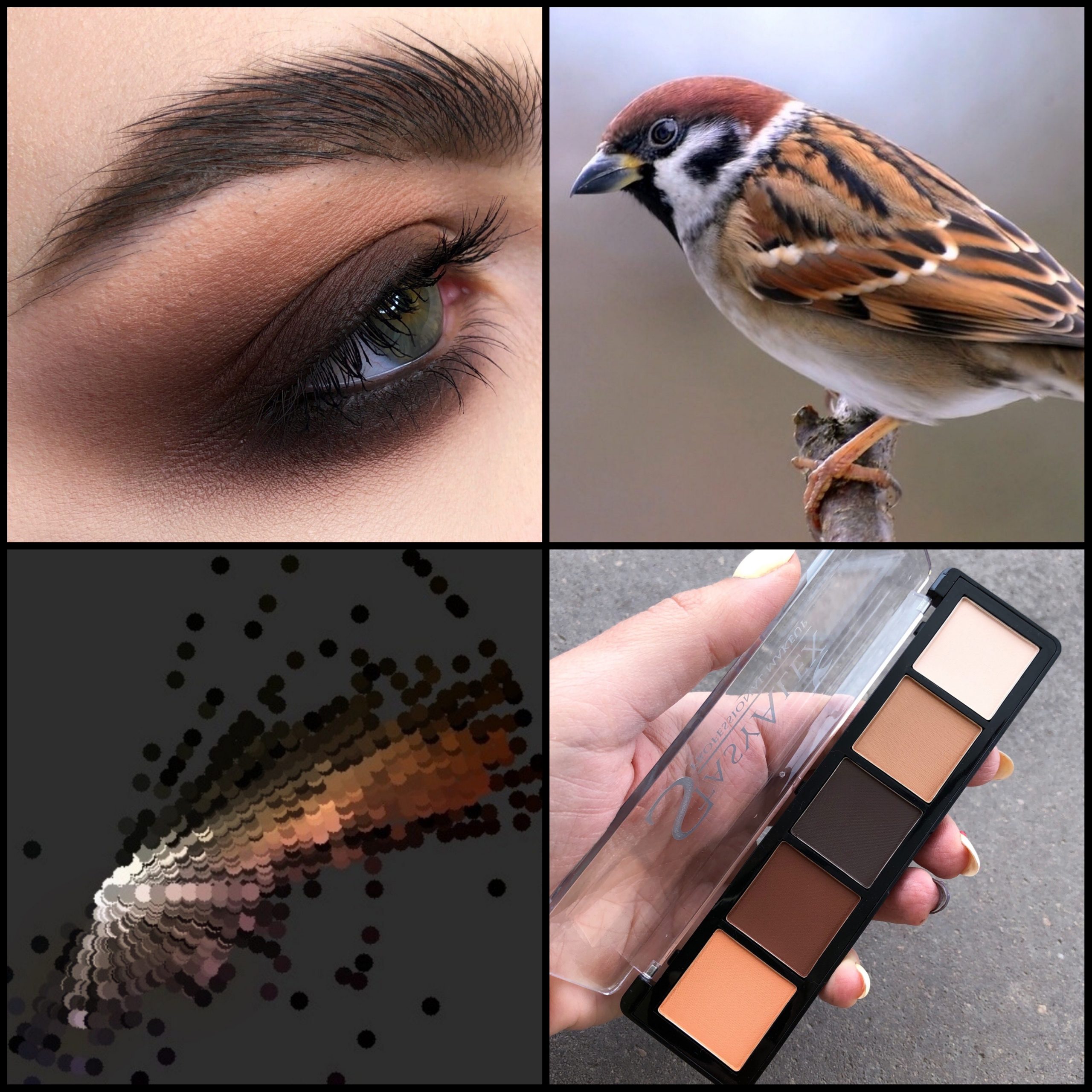 E02 Sparrow flight – matte palette of natural shades in milky-caramel-chocolate tones. This is a basic colour palette, which is suitable to any hair and eye colour. This is also flexible palette that can be used for wedding makeup and all types of commercial makeup